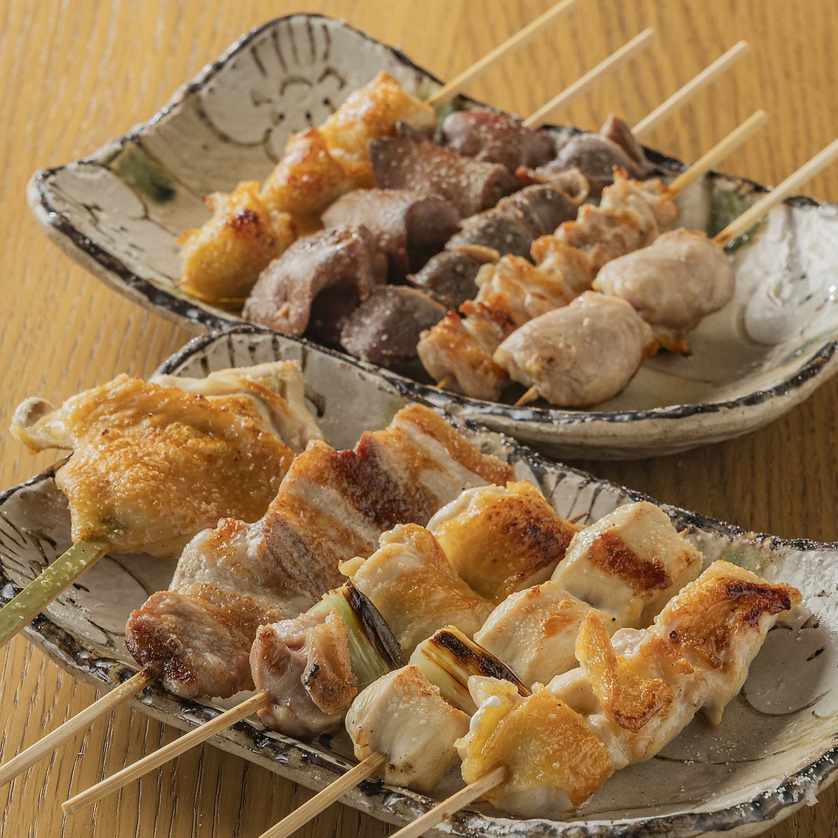 単品注文よりお得な、店主おまかせの10本盛り合わせです。四恩鶏(しおんどり)ならではの柔らかくジューシーな味わいをご堪能ください。数量限定の希少部位が入ることもございます。白レバー、ふりそで、そりは、お一人様各1本限りとなります。内容はお気軽にスタッフまでお声掛けください。